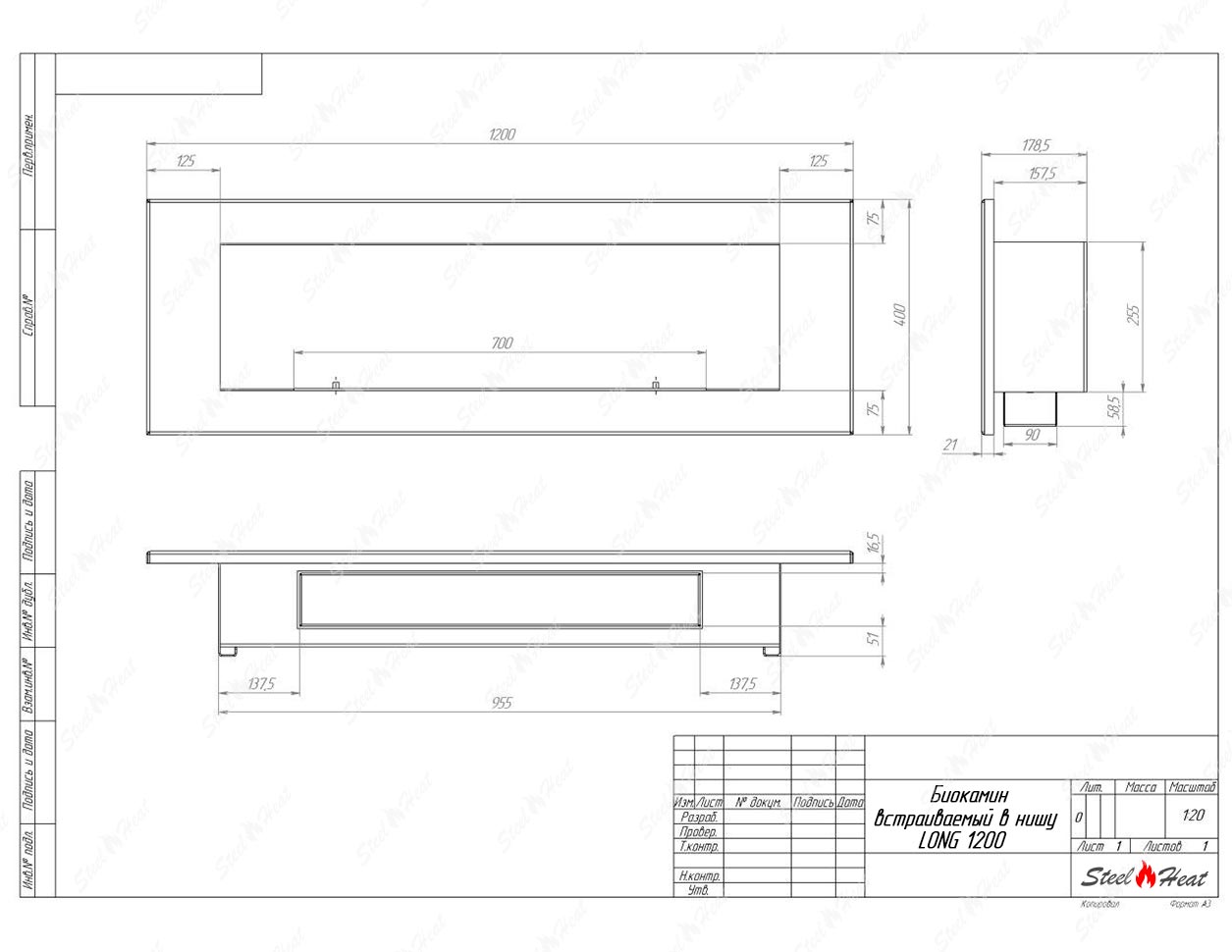 Встраиваемый Биокамин SteelHeat LONG-V 1200 предназначен для встраивания в глухие ниши из гипсокартона, кирпича, пеноблоков, бетона.